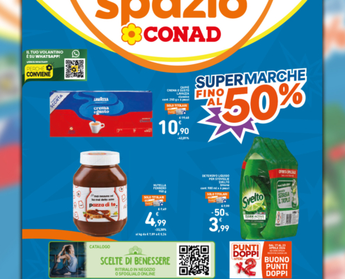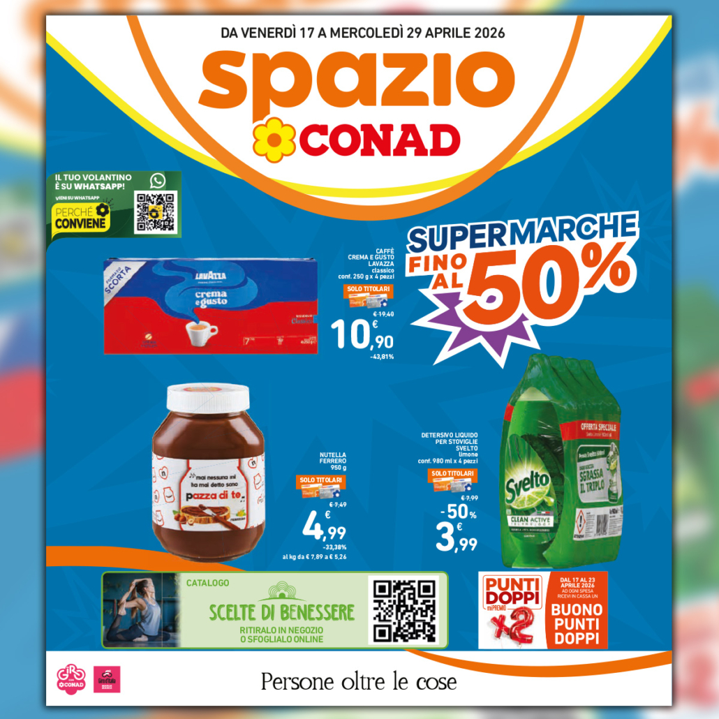 Dal 17 al 29 aprile 2026 scopri il nuovo volantino “Supermarche fino al 50%” di Spazio Conad.